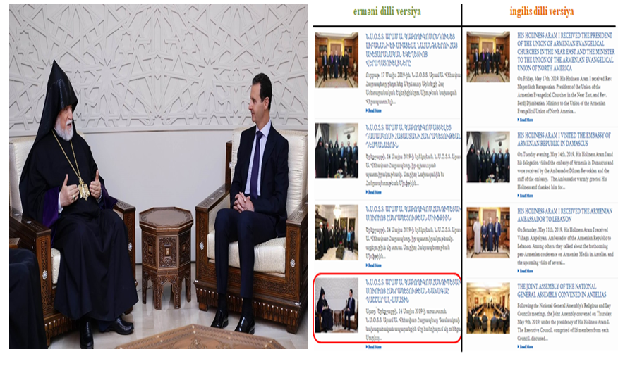 May: Kilikya Erməni Dini Evinin katolikosu I Aram Suriya prezidenti Bəşər Əsədlə görüşüb. Əsədlə görüşdə ikitərəfli münasibətlərdə tarixi əlaqələrdən söz açılıb. Lakin görüşdəki çıxışlarla bağlı bir sıra şübhəli məqamlar var. Erməni mətbuatı Əsədin “ermənilərin Suriyaya qayıtması və Suriyada yenidənqurma işlərində iştirak etməsi ilə bağlı çağırış etdiyini” xəbər başlığına çıxardıb. Ancaq, Suriya rəsmi xəbər agentliyi “SANA”-nın görüşlə bağlı dərc etdiyi materialda bu fikirlər qeyd olunmayıb. Ən maraqlısı isə erməni mətbuatının istinad elədiyi Kilikiya Erməni Dini Evinin rəsmi səhifəsində katolikos və Əsəd arasında görüş sadəcə saytın erməni dilli versiyasında əks olunub. İngilis dilli versiyada isə katolikos və Əsəd arasında olan görüşlə bağlı hər hansısa bir material mövcud deyil. Bu da, katolikosluğun Əsədlə yaxın əlaqələrinin Qərb tərəfindən tənqid olunacağından çəkindiyini göstərir.