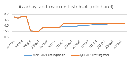 OPEC+ razılaşması əsasında keçən ilin son rübü üçün neft hasilatında nəzərdə tutulan məhdudiyyətlər böyük qismdə bu il də davam edəcək. Son razılaşmaya əsasən, Azərbaycan hazırki hasilat səviyyəsini aprel ayında da davam etdirəcək. Qlobal iqtisadi fəaliyyətin bərpasında ciddi bir yavaşlama müşahidə olunmasa, neftə bərpa olunan tələb razılaşmanın tərəfdaşı olan ölkələrə istehsalı daha da artırmağa imkan verəcək . Hal-hazırda günlük 590 min barel xam neft istehsal limiti öhdəliyini üzərinə götürən Azərbaycan bu ssenari əsasında istehsalı ilin sonuna qədər günlük 610-620 min barelə qədər qaldıracaq. Ancaq bununla belə, Azərbaycanda illik neft istehsalı təxminən keçən ilki istehsala bərabər olacaq və hazırki müqaviləyə əsasən yalnız 2022-ci ilin ortalarından sonra təbii istehsal səviyyəsinə qayıdacaq.