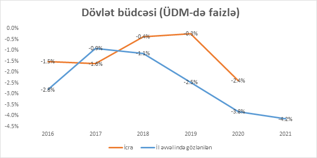 2021-ci ilin dövlət büdcəsi xərclərin keçən ilin icra rəqəmləri ilə müqayisədə daha çox olmağı hesabına 3,1 milyard manat büdcə kəsiri nəzərdə tutur. Büdcənin nisbətən pessimist ssenariyə uyğun hazırlanması və iqtisadiyyatda və neft gəlirlərində artım hesabına kəsir gözləniləndən daha az olacaq və büdcənin maliyyələşdirilməsində hər hansı çətinlik yaşanmayacaq. Xərclərin keçən ilə müqayisədə artması vaxtı çatmış borcların geri ödənilməsi və müharibə sonrası hərbi xərclərin artması ilə bağlıdır. Bu iki xərc kateqoriyası üzrə ödənişlər böyük əksəriyyət etibarilə xarici valyutada aparıldığı üçün xarici valyutaya tələbi artıraraq manat üzərində təzyiqi artıracaq. Həmçinin, bu tipli xərclər iqtisadi artıma təsir etmədiyindən xərclərdəki artım 2021-ci il iqtisadiyyatı üçün əlavə stimul kimi şərh edilməməlidir. Digər tərəfdən, büdcəni hazırlayarkən istifadə olunan baza ssenarisində neftin bir barelinin qiymətinin 40 dollar nəzərdə tutulmasına baxmayaraq, digər kateqoriyalar üzrə xərclərdə demək olar ki, olduğu kimi saxlanıldı və bazarda xarici valyuta ehtiyatı üçün əsas təminat mənbəyi olan SOFAZ-dan büdcəyə transferin həcmi azaldılmadı. Bunlar isə öz növbəsində cari ildə uzunmüddətli sərt karantin rejiminin təkrarən tətbiq edilmədiyi müddətcə iqtisadiyyatın bərpa olunmasına töhfə verəcək.