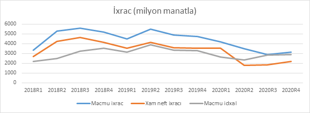 2020-ci ildə neft qiymətlərinin kəskin enməsi və ikinci rübün sonlarından OPEC razılaşması ilə bağlı olaraq neft istehsalının azaldılması nəticəsində ixrac təqribən 30 faiz gerilədi. Keçən il 16 faiz daha çox qaz ixracı neft sektoru üzrə illik itkini qarşılamağa kifayət etmədi. Neft qiymətlərinin ilin sonuna doğru artması OPEC razılaşmasının hələ də qüvvədə qalması səbəbindən ixracda ciddi bir artıma səbəb olmadı. Koronavirus şəraitində beynəlxalq ticarətdə ortaya çıxan fiziki əngəllər və əhalinin gəlirlərinin azalması nəticəsində təqribən 22 faiz daha az məhsul idxal olundu. İdxaldakı bu azalma manat üzərində təzyiqləri azaldaraq məzənnənin sabit saxlanılmasını nisbətən asanlaşdırdı.