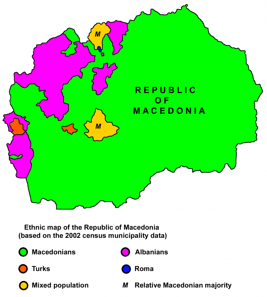2002-ci ilin siyahıyaalma nəticəsinə əsasən, Makedoniyada 77,959 türk yaşayır ki, bu da ümumi əhalinin 3.9%-i deməkdir. Təbii ki, bu rəqəm böyük ehtimalla siyahıda göstəriləndən daha çoxdur, çünki rəsmi məlumat Avropada işləyən Makedoniya türklərini hesaba almayıb.