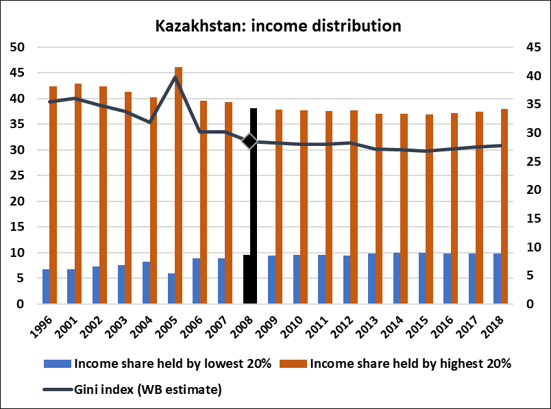 For WB’s definition, the income shares of the lowest or highest 20% of the population specify the portion of indicated subgroups of the people in the total national income or annual consumption. Gini index estimates the income distribution among persons and families in the national economy ranging from 0 (perfect equality) to 100 (complete inequality). Income share held by the lowest 20% of the population in Kazakhstan improved after 2001 till 2008 but had stalled in that year. The lowest quintile's income share had a 33% growth percentage for 2001-2007. But income share held by the lowest 20% had increased only 3% between 2008-2018. The income share held by the highest 20% of the population in Kazakhstan declined between 2001-2007 around 8%, but again the tempo had stagnation for 2008-2018 (less than 1%).