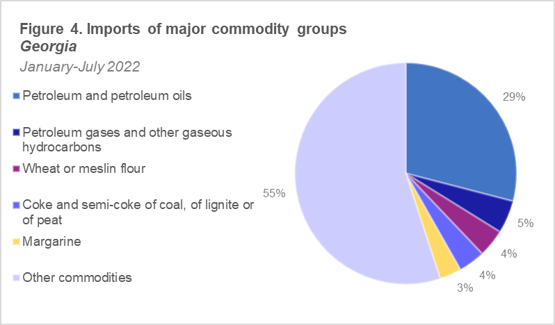 Looking at Georgian trading partners by exports, Russia was among the top three in January-July 2022, accounting for 10.9% of the total exports, following China (15.3%) and Azerbaijan (11.3%). Respectively, for the same time duration, the share of imports from Russia was the second biggest (12%), following Turkey (17%).