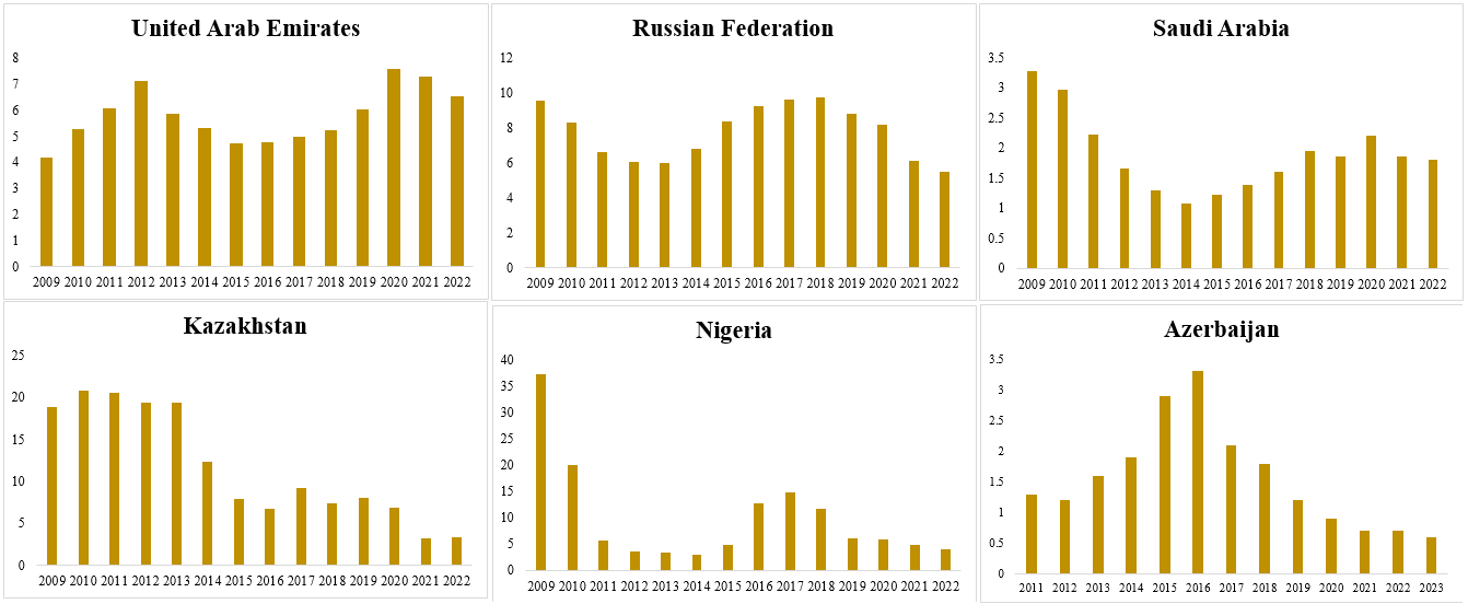The channel through which the over-optimism leads to increase in overdue loans is the underestimation of repayment challenges or overestimation of business success. Optimistic borrowers assume that they will earn more income in the future, hence tend to borrow more today at the ongoing interest rate. Once the economy is hit by unexpected shocks and income becomes subject to severe volatility, they struggle to meet their repayment obligations, pushing loans into overdue status. In the case of entrepreneurs, they expect higher revenues for new ventures, making them borrow more aggressively and taking them excessive debt. In case their business fails or underperforms during recession or crisis, they default on loans, increasing the NPL ratio in banking sector and thus, deteriorating the financial stability so as economic growth at the end of the day. This situation was widely observed in the case of commodity producers during 2014-2016 oil price plunge which significantly declined the government revenue for countries like Azerbaijan, Russia, Kazakhstan, Saudi Arabia, United Arab Emirates, Nigeria, and other oil exporters, which is depicted in the Figure 1. From the dynamics of overdue loans, it can be seen that some of these countries like Azerbaijan, Russia, and Nigeria experienced the increase in overdue loans immediately during 2014-2016 oil price crisis, while others (UAE, Saudi Arabia, and Kazakhstan) observed it during post-crisis period.
