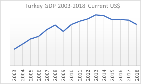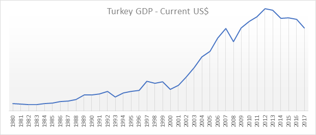 The first glance at the Turkish Gross Domestic Product suggests dramatic growth from 1980 till now (Figure 1). However, it is important to break down Figure 1 into three parts to sense the changing dynamics in the GDP growth over these years.