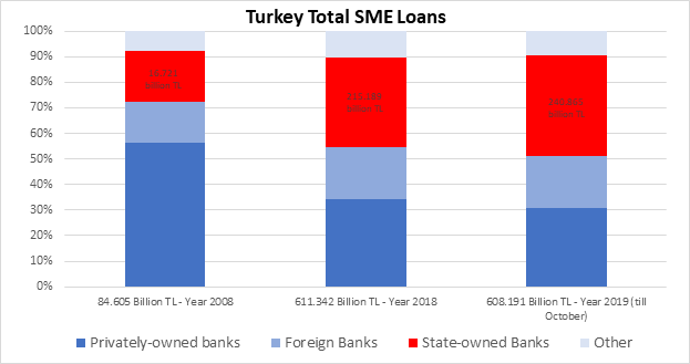 However, after 2013, the populist policies pursued by the ruling conservative-democratic AK party led to credit expansions and increased share of state-owned banks. The establishment of the Credit Guarantee Fund made credits for small and medium-sized enterprises (SMEs) accessible. The state-owned banks hold a great role in this process. Figure 4 shows that in 2008, the share of SME loans by state-owned banks in total SME loans was below 20%, however, in 2018 it constituted 35.2%. SME loans by state-owned banks continued to accumulate even after the 2018 crisis and reached the level 240.865 billion TL in 2019 (till October), or 40% of the aggregate SME loans. It is quite problematic to view this loan expansion as a healthy process since the privately-owned and foreign banks decreased their SME loans after 2018 considering the growing risks of loan failure.