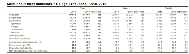 Albeit the number of people who are eligible to work was 61.469 million (Table 1) in 2019, the labor force which contains the number of employed and unemployed people (people who do not work and are seeking jobs) is 32.549 million. It is a 53.0% labor force participation rate. The low labor force participation rate is structurally deepened by the gender differences in employment. In 2019 there were 11.359 million people who are not in the labor force and claim to be fully preoccupied with house duties. Practically 100% of them are women. Considering the potential contribution of those women to the economy, one might argue the growth capacity of Turkish economy is systematically underused. Nonetheless, one should also consider that maybe the growth capacity ought to be defined not based the outcomes of people’s possible preferences that are nor realized, but the existing ones. After all, participation in the labor force is a preference.
